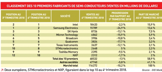 A lors que Samsung a dominé les ventes de semi-conducteurs pendant cinq trimestres consécutifs, Intel arepris la première marche du podium àSamsung au quatrième trimestre 2018 selon le cabinet d’études IHS Markit. Le chiffre d’affaires des semiconducteurs d’Intel