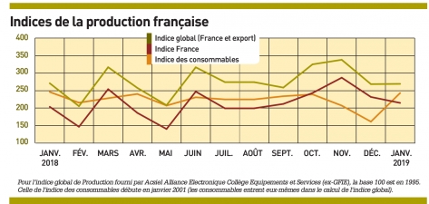 > L’indiceFrancedejanvier par rapport àcelui de décembrebaisse de 7%.Pour rappel, pour la même période de 2018, il était en augmentation de 14%. Si l’on compareles indices de janvier 2019 àceux de l’an passé, tous sont en baisse, voireenfortebaisse, àl’exceptiondel’indiceconsommables qui resteàpeu près stable(-1,2%).