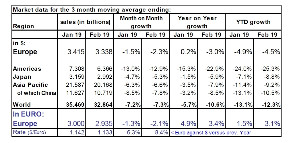 Toutes les autres régions ont également souffert en février dernier, que ce soit par rapport février 2018 ou par rapport au mois précédent, selon le WSTS. Le marché d’Asie-Pacifique hors Chine a baissé de 5,1% par rapport à janvier 2019 et de 7,2% par rapport à février 2018, le Japon respectivement de 5,3% et de 5,9%, la Chine de 7,8% et de 8,5%, et les Amériques accusant les plus fortes baisses (-12,9% séquentiellement et -22,9% sur un an).