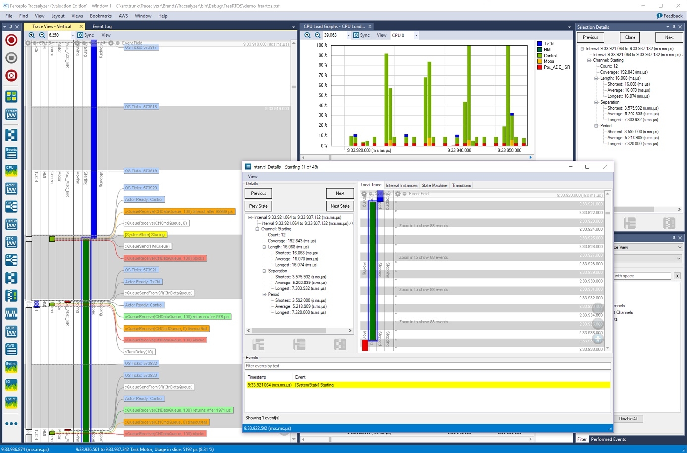 « Il s’agit là d’une étape majeure dans l’évolution de notre outil. La nouvelle vue “Détails d’intervalle” [voir photographie] fournit par exemple une bien meilleure vision d’ensemble des machines d’état et des autres intervalles personnalisés de la trace. Cela fonctionne de la même façon que pour les tâches et les événements : il suffit de double-cliquer sur une entrée dans un champ “Intervalle” », explique Johan Kraft, fondateur et CEO de Percepio.