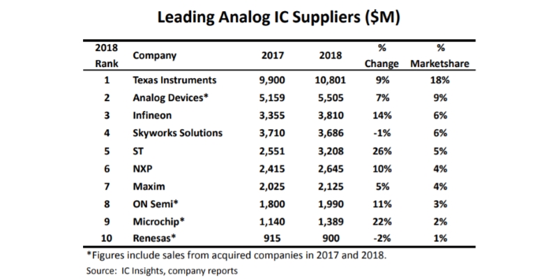 D’après une étude de la société d’analyse IC Insights, le marché mondial des composants analogiques a passé la barre des 60 milliards de dollars en 2018. Un marché de plus en plus dominé par Texas Instruments (18% de part de marché, 10,8Md$ de chiffre d’affaires), dont les ventes représentent quasiment le double de celles de son dauphin Analog Devices (5,5Md$). Suivent Infineon (3,8Md$, +14%), Skyworks (3,7Md$, -1%), STMicroelectronics (3,2Md$, +26%) et NXP (2,6Md$, +10%), devant Maxim, ON Semi, Microchip et Renesas. Ce top 10 concentre environ 60% des ventes mondiales de circuits analogiques.