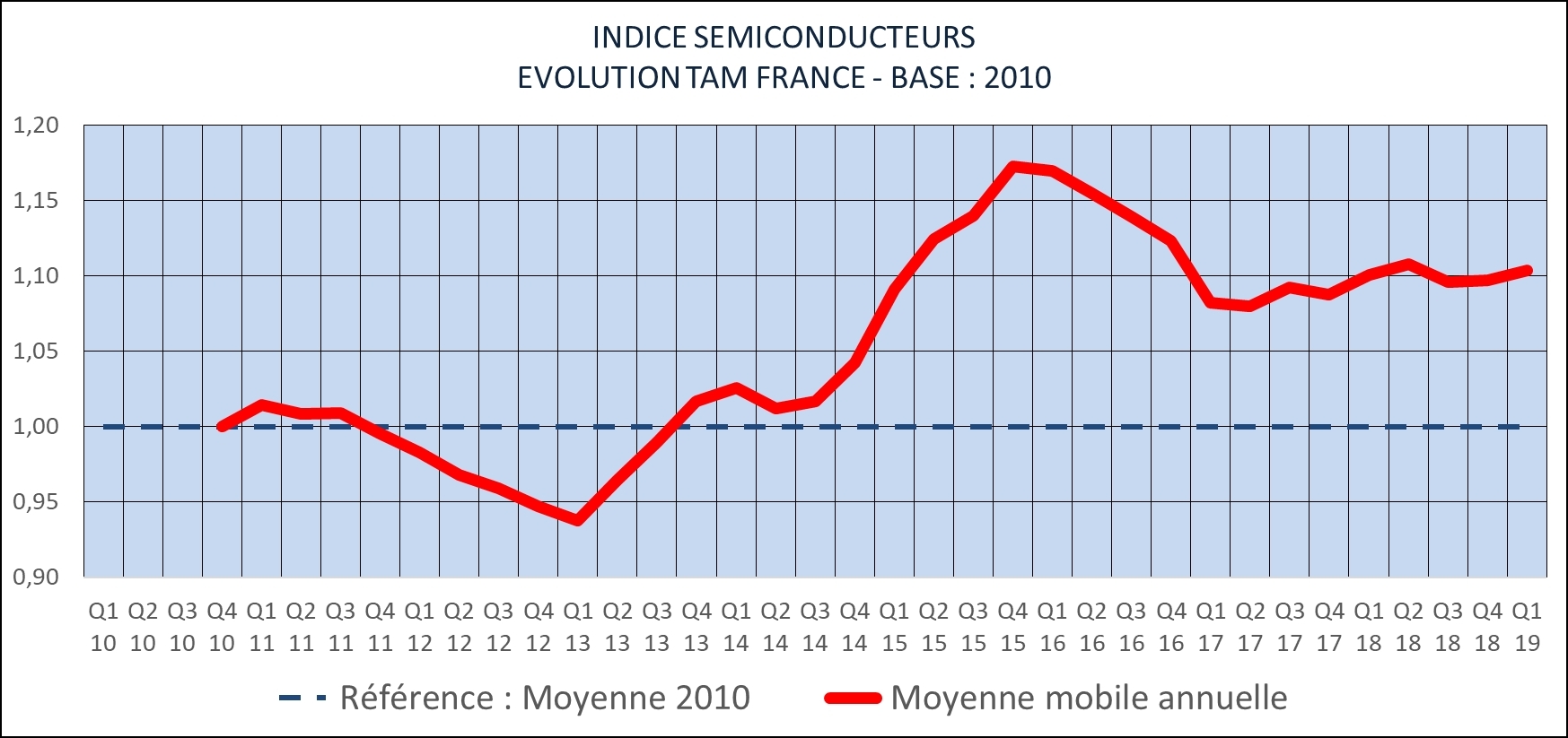 Au cours du premier trimestre 2019, le marché français n’a reculé que de 0,6% (contre -2,2% en euros pour l’Europe et -16% en dollars pour le marché mondial). Il semble avoir été relativement protégé de certains aléas conjoncturels par sa structure propre, en particulier sa faible exposition au marché des mémoires.