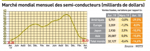 > Les ventes mondiales de semi-conducteurs ont représenté 32,127 milliards de dollars en avril 2019, en baisse de 0,4% par rapport au mois précédent, mais de 14,6% par rapport à avril 2018, selon le WSTS. C’est le continent américain qui est le plus affecté par la récession (près de 30% de baisse par rapport au