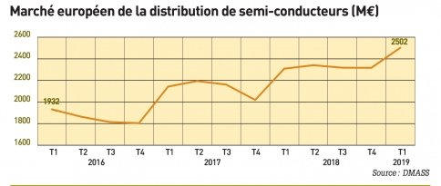> Au premier trimestre 2019, le marché européen de la distribution de semi-conducteurs industriels (hors composants pour PC) a progressé de 8,4% par rapport au premier trimestre 2018, à 2,5 milliards d’euros, selon DMASS. Le marché français a affiché une hausse de 8%.