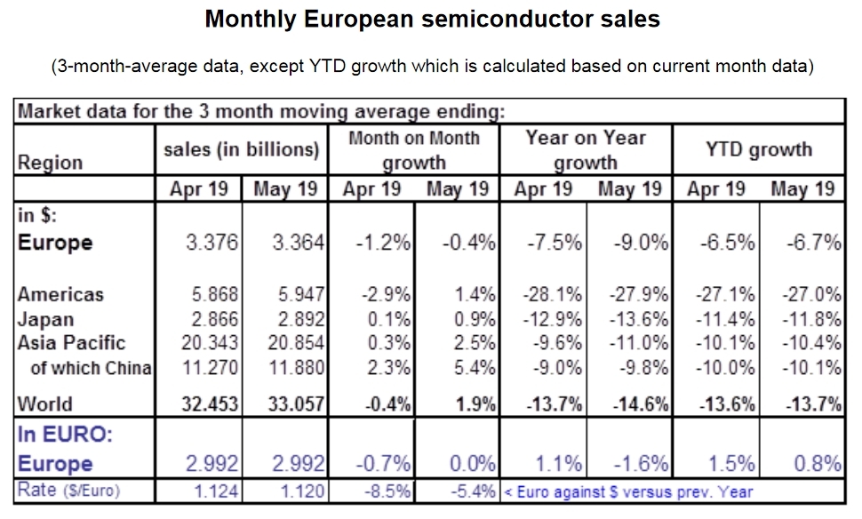 Les ventes européennes de semi-conducteurs en mai 2019 ont atteint 3,364 milliards de dollars, en baisse de 0,4% par rapport à avril 2019. Au plan mondial, les ventes de semi-conducteurs ont atteint 33,057 milliards de dollars en mai 2019, en hausse de 1,9% par rapport au mois précédent.
