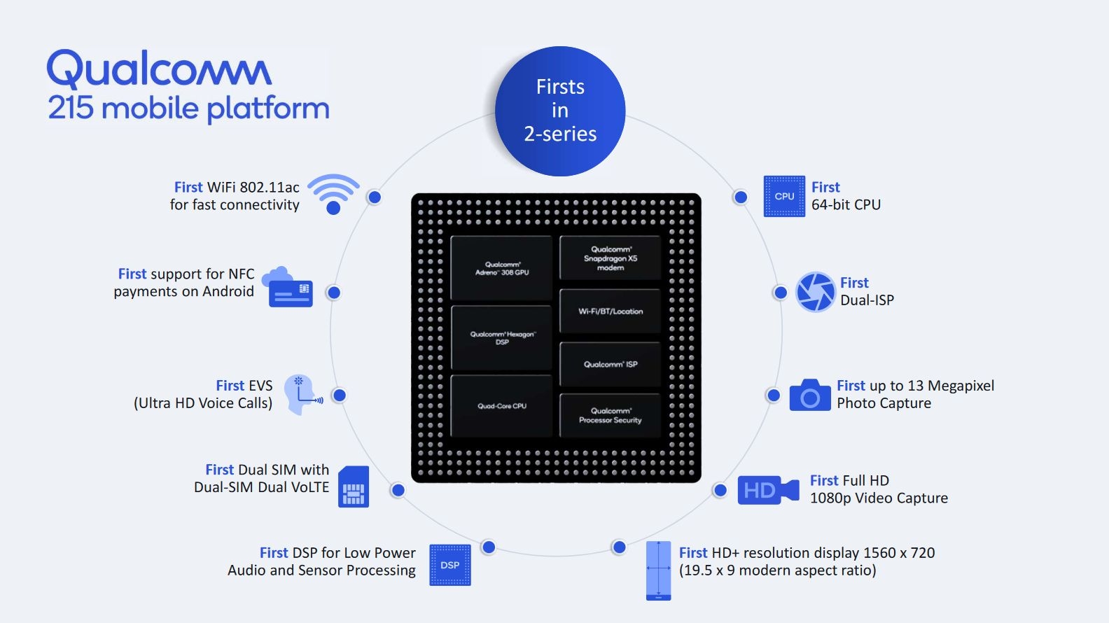 Qualcomm commercialisera en volume au second semestre 2019 sa plateforme 215 visant les téléphones portables d’entrée de gamme. Comprenant quatre coeurs Cortex-A53, le Qualcomm 215 est le premier modèle 64 bits de cette famille et offre 50% de puissance de calcul en plus par rapport aux modèles précédents de l’américain. Il embarque également un moteur graphique Adreno 308, un DSP Hexagon servant entre autres au décodage audio et deux moteurs de traitement d’images pour gérer deux modules caméras distincts jusqu’à 13 MPixels. Le modem Snapdragon X5 intégré supoprte les réseaux LTE cat. 4, le Wi-Fi 802.11ac et les paiements NFC.