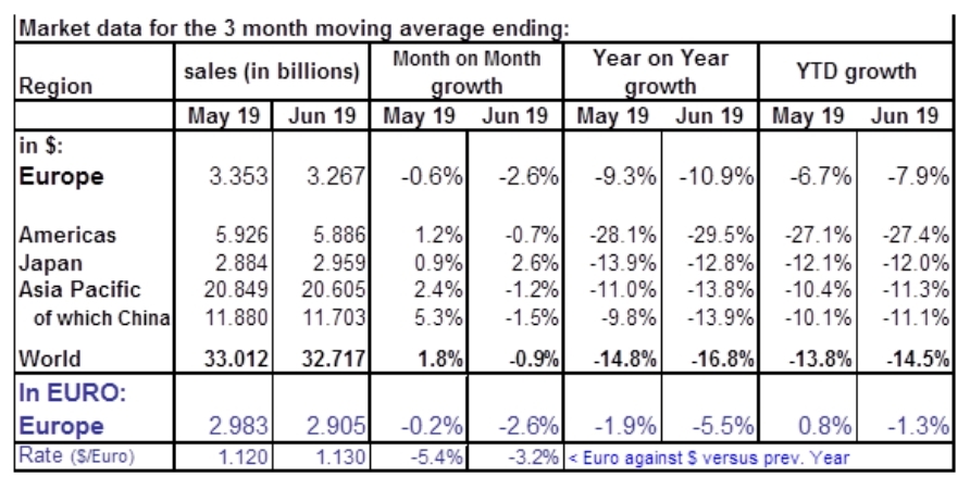 La comparaison des chiffres du WSTS, en dollars, montre une baisse des ventes de semi-conducteurs de 7,9% en Europe au premier semestre 2019, alors que la chute atteint 14,5% à mi-année au niveau mondial.