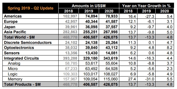 Le marché mondial des semi-conducteurs a augmenté de 13,7% en 2018 pour atteindre 468,8 milliards de dollars, représentant un record absolu. Mais, l’année 2019 devrait s’établir à 406,6 milliards de dollars, en baisse de 13,3%, estime le WSTS, l’organisme en charge des statistiques mondiales sur les semi-conducteurs, dans sa dernière publication incluant les chiffres réels du deuxième trimestre 2019.. Toutes les régions du monde devraient voir leurs ventes diminuer cette année.