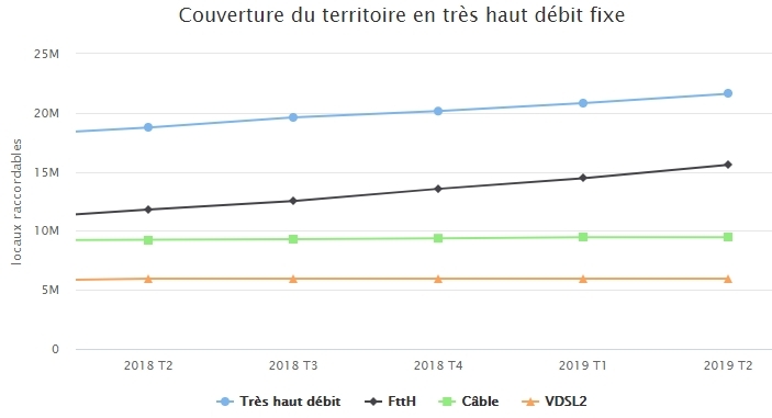 Au total, à la fin du second trimestre 2019, 21,6 millions de locaux étaient éligibles à des services à très haut débit, toutes technologies confondues, dont 15,4 millions en dehors des zones très denses.