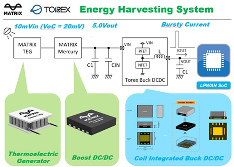Ce “reference design” combinera le savoir-faire de Matrix en sciences des matériaux thermoélectriques et en ingéniérie thermique et l’expertise de Torex en technologies de semi-conducteurs à faible consommation et en gestion efficace de l’énergie. Concrètement, il sera fait appel à un générateur thermoélectrique et à un convertisseur DC-DC élévateur Mercury de Matrix, ainsi qu’à un convertisseur DC-DC abaisseur avec inductance intégrée de Torex.