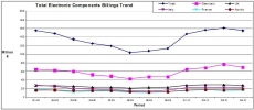 Les facturations ont, elles, enregistré un recul séquentiel de 4 % et une hausse sur un an de 37 % (+43 % en semi-conducteurs, +31 % en passifs et +22 % en composants électromécaniques).