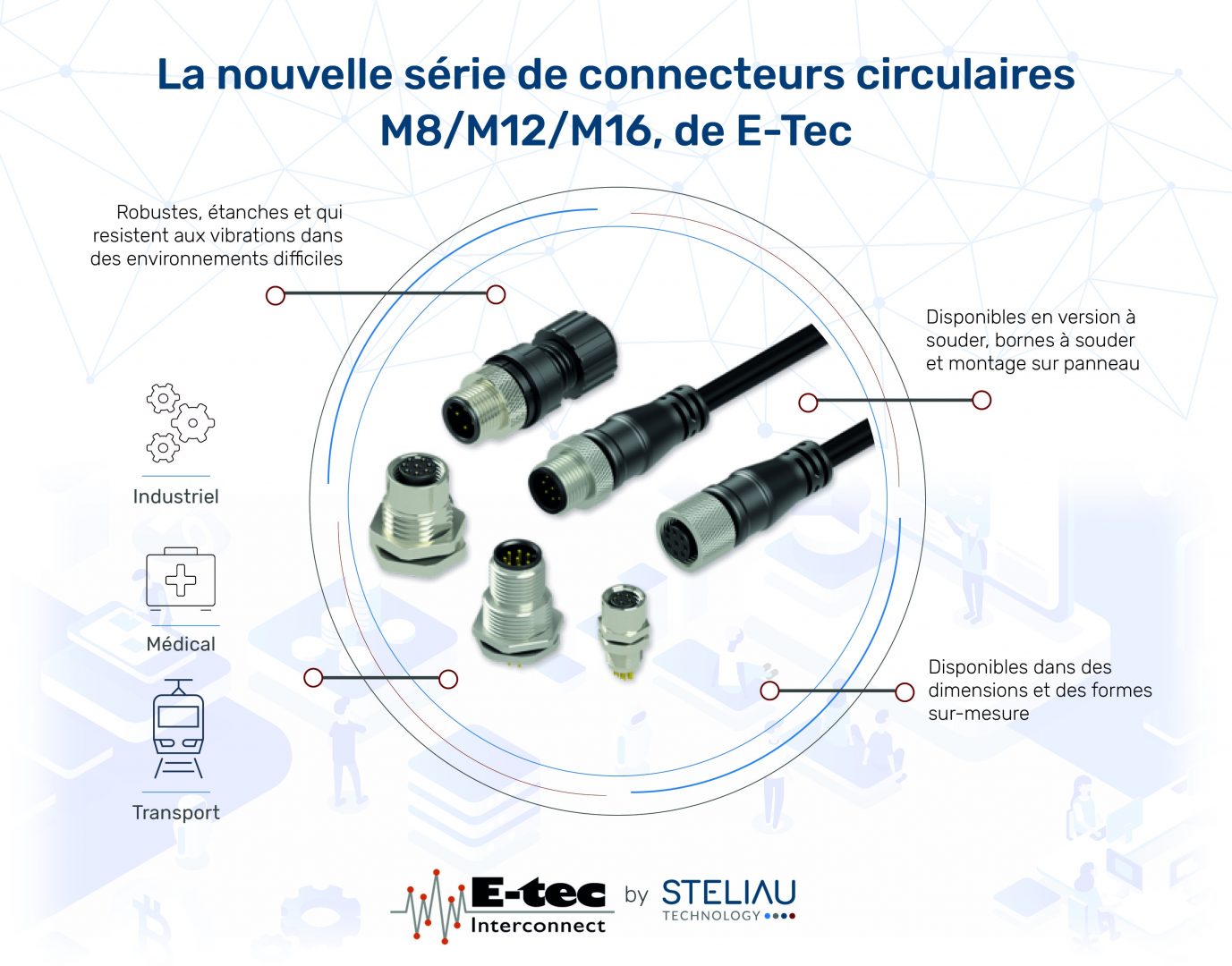 La gamme de connecteurs circulaires M8/M12/M16 du fournisseur E-tec offre une sélection des codes les plus courants (A, B et D) conformément aux normes IEC 61076-2-104 et IEC 61076-2-101.