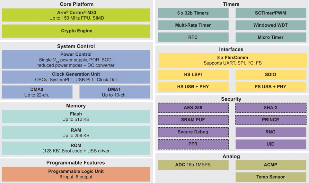 Soucieux d’étendre sa famille de microcontrôleurs de milieu de gamme LPC5500, NXP Semiconductors lui adjoint les LPC552x/S2x fabriqués en technologie 40nm. Ces circuits embarquent un coeur Cortex-M33 cadencé à 150MHz, 256Ko à 512Ko de mémoire flash, jusqu’à 256Ko de Sram, des modules de sécurisation des données (avec, pour les S2x, cryptage de données) et cinq canaux différentiels de conversion analogique-numérique 16 bits. Parmi les interfaces présentes figurent des ports FlexComm et USB. Les LPC552x/S2x sont encapsulés en boîtier HLQFP100, VFBGA98 et HTQFP64 et vendus 1,63$ pièce par quantités de 10.000.