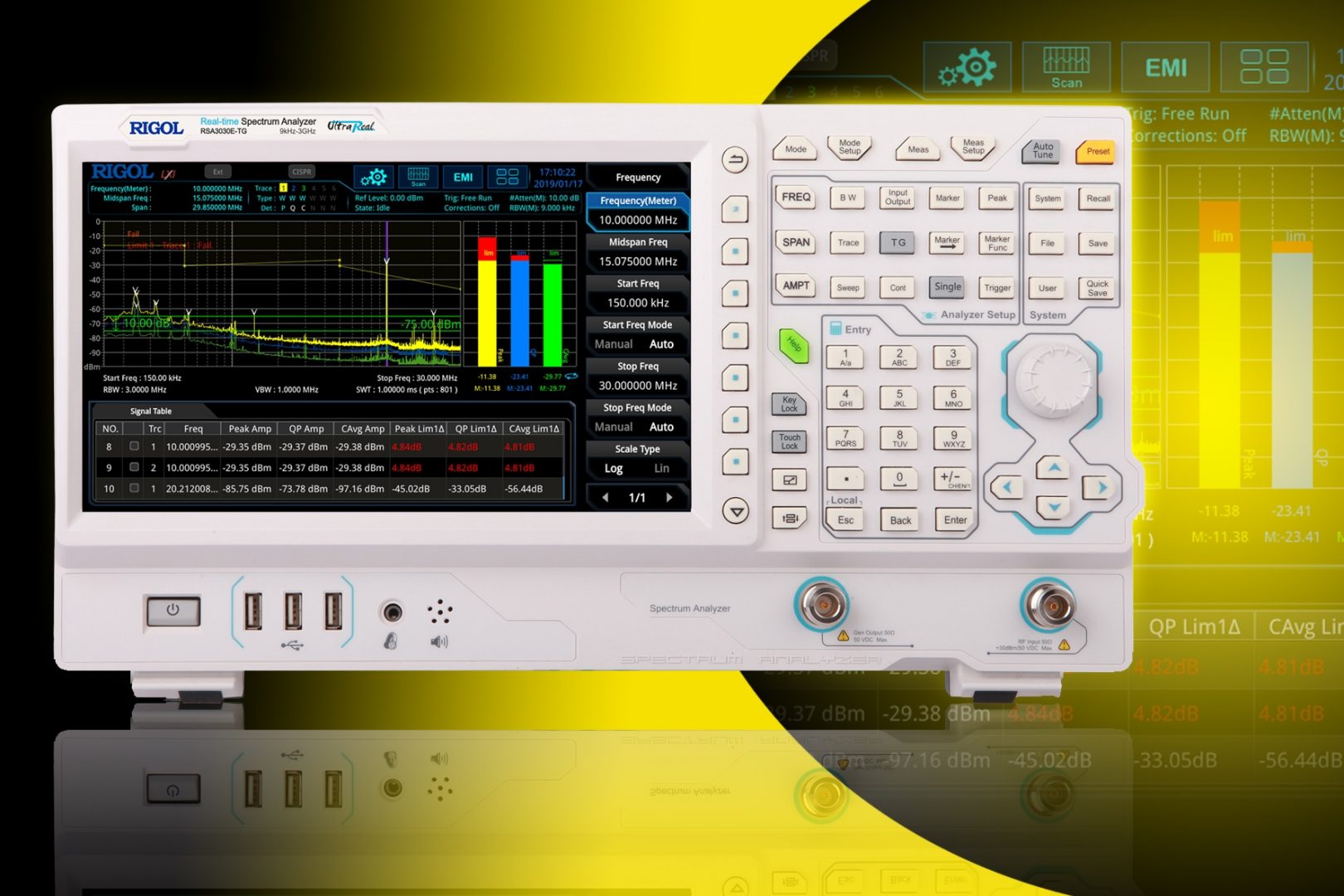 Les utilisateurs sont en effet en mesure de faire des analyses de spectre temps réel ou non, avec une largeur d’analyse temps réel de 10 MHz, de démodulation ASK/FSK (option -ASK/FSK) et des tests de pré-conformité selon la norme CISPR (option -EMI). Chaque analyseur est également disponible avec un générateur de poursuite en option (-TG).