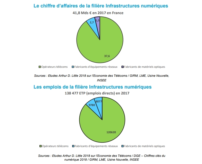 La filière « Infrastructures numériques » rassemble les fabricants de composants et d’équipements réseaux (Afnum), les opérateurs d’infrastructures fixes et mobiles et de services de communications électroniques (FFTélécoms), les fabricants de matériels et câbles de communication/très haut débit (Sycabel) et les entreprises de la connectivité et des réseaux d’initiative publique (InfraNum). Elle s’appuie sur de nombreux centres de recherche et pôles de compétitivité pour favoriser son essor économique et développer ses activités R&D. La filière réalise un chiffre d’affaires de plus de 40 milliards d’euros, dont la majeure partie est issue des activités télécoms, et compte environ 13 000 entreprises majoritairement constituées de TPE/PME. Au total, la filière compte près de 140 000 emplois directs.