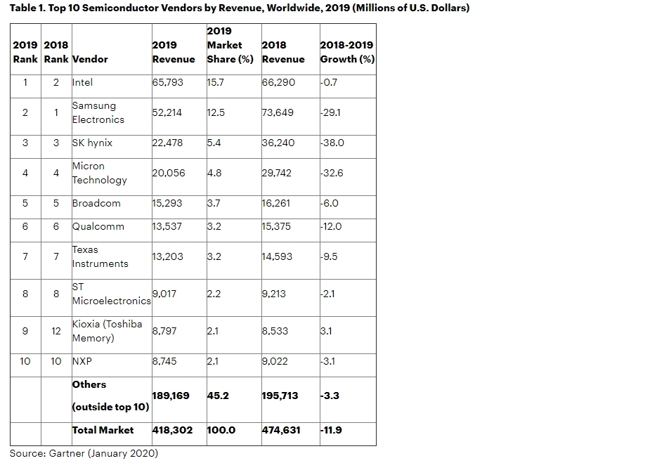Les ventes mondiales de semi-conducteurs ont totalisé 418,3 milliards de dollars en 2019, en baisse de 11,9% par rapport à 2018, selon les résultats préliminaires de Gartner. Intel a regagné sa première place sur le marché, car le ralentissement du marché des mémoires a eu un impact négatif sur la plupart des principaux fournisseurs, notamment Samsung, qui était le numéro un mondial en termes de revenus en 2018 et 2017.