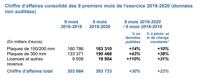 Par rapport au 3è trimestre de l’ewercice 2018-2019, les ventes de tranches de 150/200 mm ont progressé de 2% à taux de change constants, tandis que les ventes de tranches de 300 mm ont augmenté de 19%. Par conséquent, la part des ventes de tranches de 300 mm est passée de 47 à 51% du total des ventes de tranches, tandis que la part des ventes de tranches de 150/200 mm a atteint 49% du total des ventes de plaques contre 53% au 3è trimestre 2018-2019.