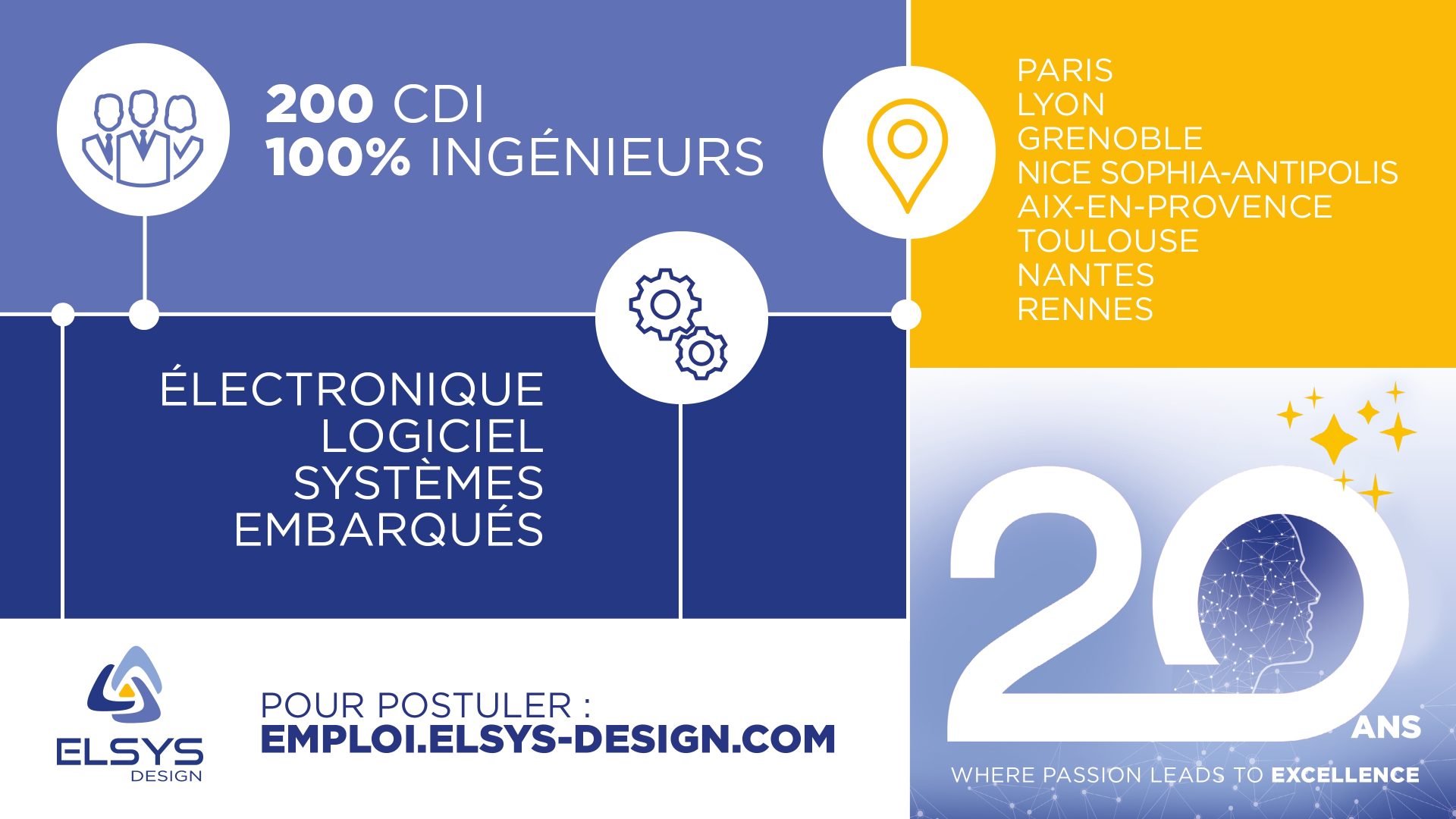 La société d’ingénierie recrute pour ses implantations de Paris, Lyon, Grenoble, Nice Sophia-Antipolis, Aix-en-Provence, Toulouse, Nantes et Rennes. La société recherche des collaborateurs passionnés, débutants ou expérimentés, mêlant savoir-faire et savoir-être. A noter que l’année 2020 marque les 20 ans d’Elsys Design, une société d’Advans Group.