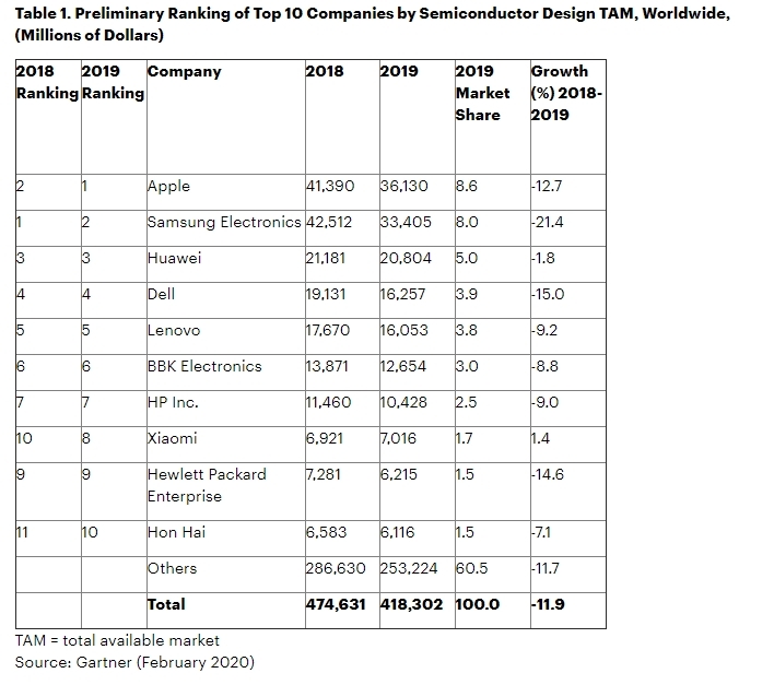 Les dépenses mondiales de semi-conducteurs ont diminué en raison du ralentissement économique et de la chute des prix des mémoires, note Gartner. Apple a pris la première place parmi les clients mondiaux des semi-conducteurs en 2019, avec 8,6% du marché mondial devant Samsung qui a chuté au deuxième rang avec 8% de part de marché.