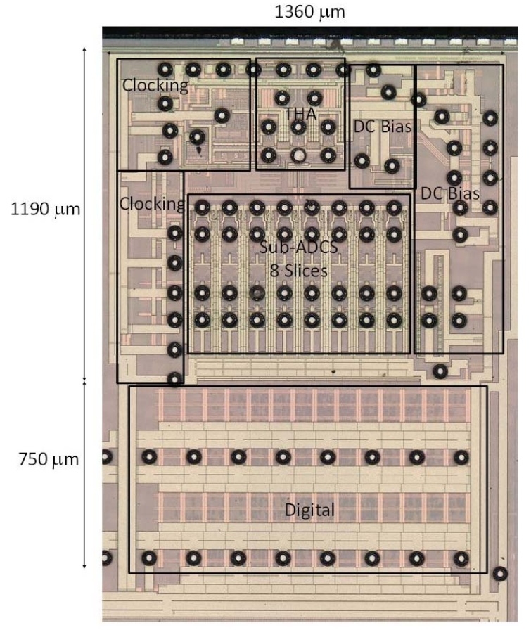 San Francisco – Analog Devices a présenté à la conférence ISSCC un CAN 12 bits délivrant pas moins de 18Géch./s (l’état de l’art se situant plutôt à 10Géch./s à cette résolution), et principalement destiné à l’échantillonnage de signaux RF. Analog Devices a choisi d’utiliser, en lieu et place du buffer d’entrée classique, un bloc d’amplification track-and-hold (THA) pilotant huit moteurs de conversion analogique-numérique à pipeline afin de limiter les problèmes d’échantillonnage RF et la valeur de la capacitance d’entrée. En faisant porter une partie du travail sur les épaules de ce THA, l’architecture d’Analog Devices permet d’utiliser des sous-CAN pipeline relativement rapides et économiques car implémentables dans un process à géométrie fine, ici du FinFET 16nm. La puce finale occupe 2,6mm² de silicium (un bon tiers étant dévolu aux nombreux blocs de calibration et de compensation numériques), consomme 1,3W à plein régime avec une bande passante d’entrée de 18GHz, un plancher de bruit de -157dBFS/Hz et une marge dynamique SFDR de 56dB à 4GHz et 54dB à 8GHz.