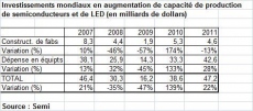 La progression de capacité de 2011 résulte d’une augmentation conséquente des investissements en constructions de nouvelles usines et en achats d’équipements de fabrication à destination tant de ces nouvelles constructions que des usines en fonctionnement (cliquer sur le tableau pour l’agrandir).