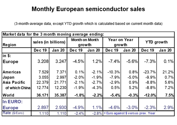 L’Europe a été la seule région au monde à enregistrer une croissance mensuelle en janvier. Les ventes mondiales de semi-conducteurs se sont élevées à 35,387 milliards de dollars en janvier 2020, en baisse de 2,2% par rapport au mois précédent et de 0,3% par rapport au même mois de 2019.