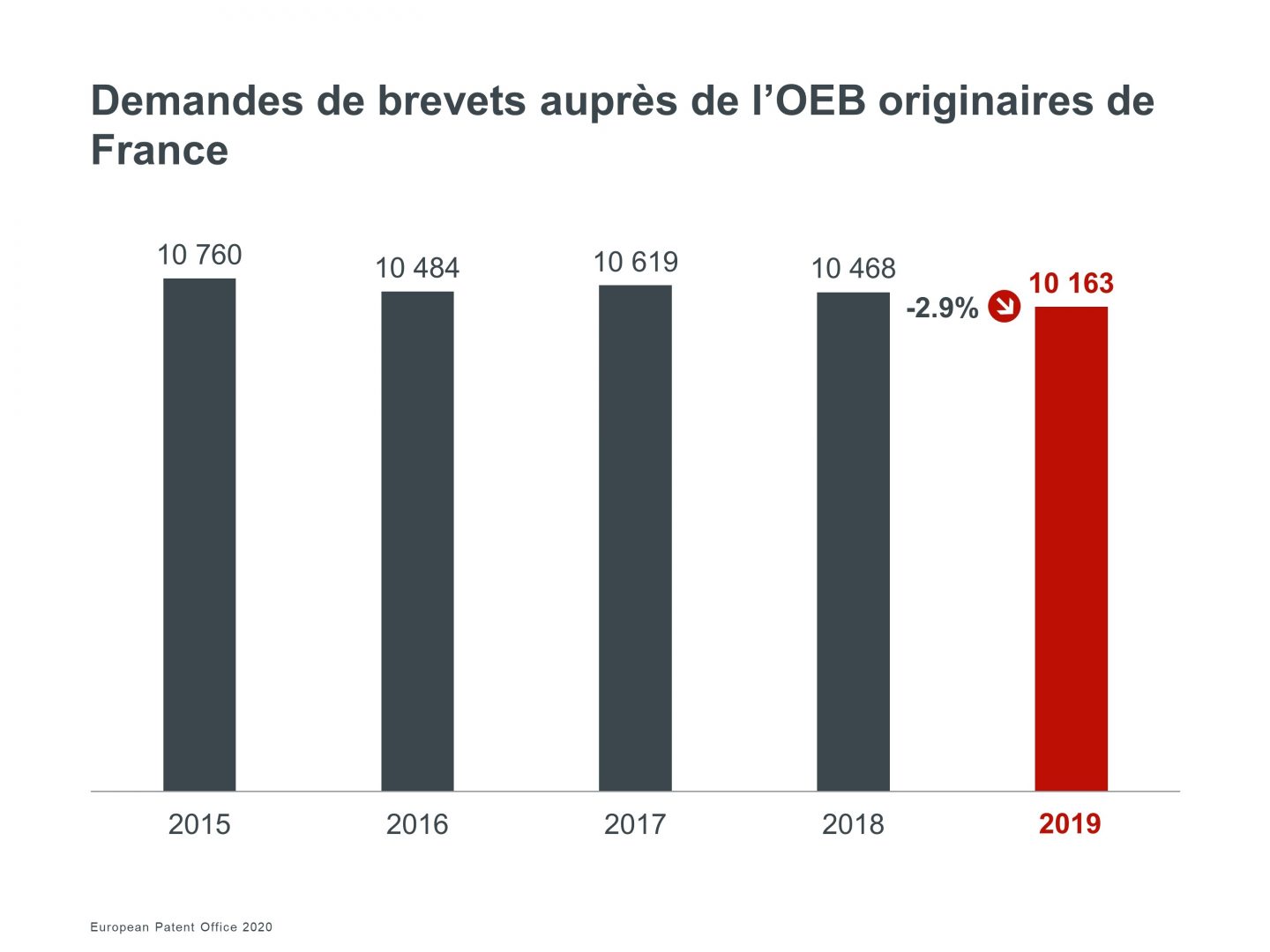 Avec 10 163 demandes déposées en 2019, la France reste le 2e pays européen le plus innovant auprès de l’OEB (Office européen des brevets). Elle se positionne derrière l’Allemagne qui conserve la 1ère position (26805 demandes) et devant la Suisse (8249 demandes). Néanmoins, après une baisse de 1,4 % en 2018, la France enregistre un nouveau recul du nombre de demandes de brevets en 2019 (-2,9 %), notamment dans des secteurs tels que les transports ou la communication numérique.