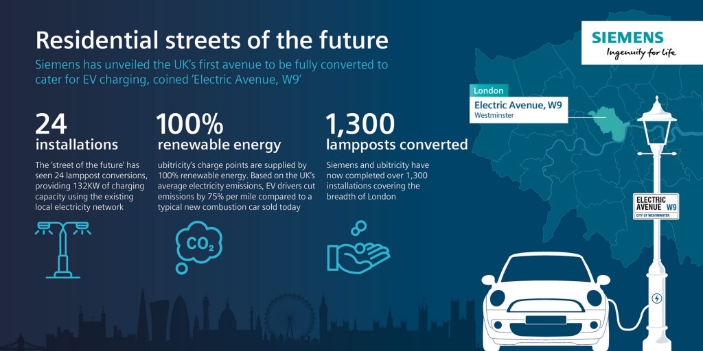 Sutherland Avenue, à Londres, qui fait plus d’un demi-mile de long, est la première avenue résidentielle du Royaume-Uni où 24 lampadaires ont été convertis par Siemens en bornes de recharge pour véhicules électriques.