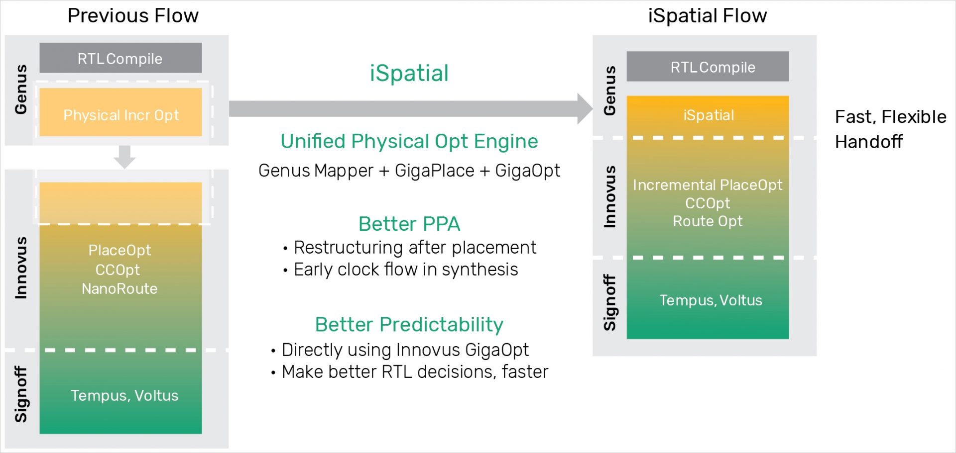 Cadence Design Systems a mis à jour son outil de conception numérique, désormais rassemblé sous l’étiquette iSpatial Flow. Grâce à de nouveaux moteurs d’optimisation pour le placement-routage et au recours à des algorithmes IA de type machine learning, le processus de conception devient jusqu’à trois fois plus rapide et les performances PPA (puissance consommée, performances et aire de silicium occupée) affichent un gain culminant à 20%. Les outils Genus (synthèse physique) et Innovus (implémentation) ont été rapprochés, avec une interface et une base de données communes. De même, la validation (sign-off) simultanée des cibles physiques, temporelles et fonctionnelles réduit les marges de conception et les itérations nécessaires.