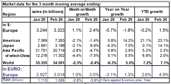 En ce qui concerne les autres régions, il convient de noter la baisse mensuelle de 7,5% du marché chinois des semi-conducteurs, en raison de la crise du Coronavirus qui était déjà très forte à cette époque en Chine. L’Europe a réellement commencé à en souffrir en mars et les conséquences devraient donc se faire sentir lors de la prochaine publication du WSTS (qui communiquera les statistiques de mars au début du mois de mai).