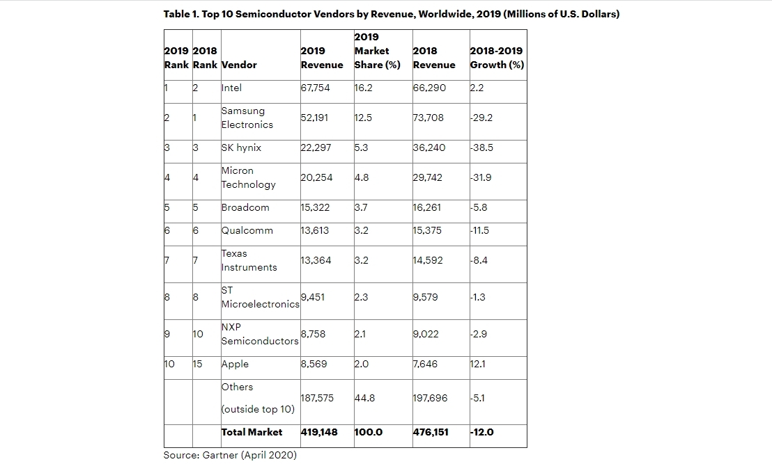Intel a retrouvé la position de numéro un, car le ralentissement du marché des mémoires a eu un impact négatif sur de nombreux principaux fournisseurs, notamment Samsung Electronics, qui était numéro un des ventes en 2018 et en 2017.
