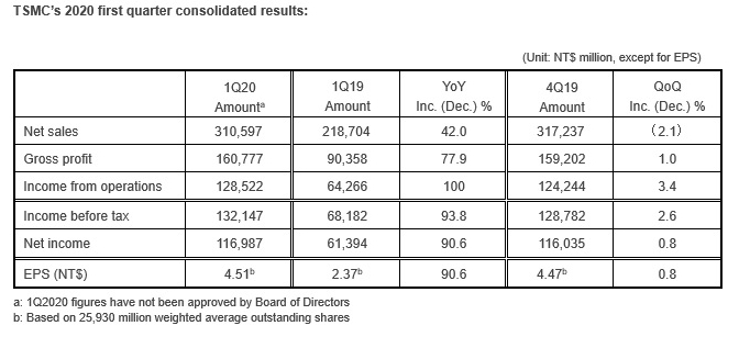 Par rapport à la même période de l’an passé, le chiffre d’affaires de TSMC a augmenté de 42% au premier trimestre, tandis que le résultat net et le bénéfice par action dilué ont tous deux augmenté de 90,6%. Par rapport au quatrième trimestre 2019, le chiffre d’affaires du premier trimestre a baissé de 2,1% et le résultat net a progressé de 0,8%.