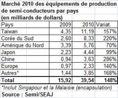 En 2010, le marché mondial des équipements de fabrication de semi-conducteurs (production de tranches de silicium et de circuits, encapsulation et test) a progressé de 148 % par rapport à 2009, à 39,54 milliards de dollars, annonce Semi reprenant ses données ainsi que celles de l’association japonaise SEAJ.