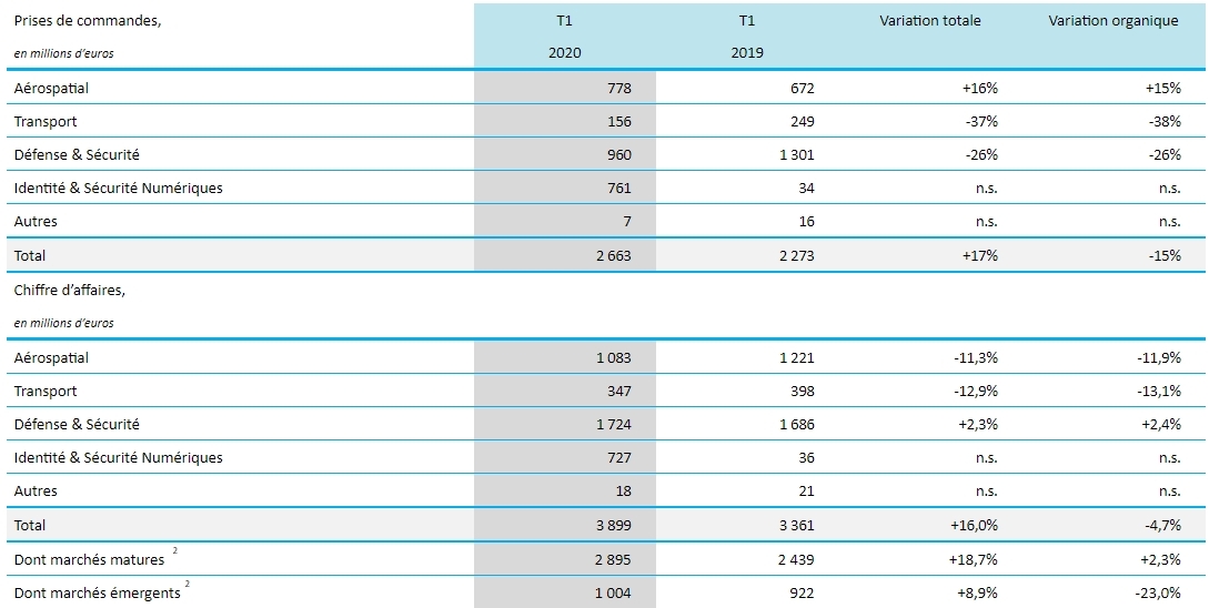 Le chiffre d’affaires du premier trimestre 2020 s’établit à 3,899 milliards d’euros, contre 3,361 milliards d’euros au premier trimestre 2019, en hausse de 16% à données publiées, et en baisse de 4,7% à périmètre et taux de change constants. Corrigé de l’impact estimé des perturbations induites par la crise du Covid-19, le chiffre d’affaires enregistre une légère croissance, en ligne avec les attentes. L’impact de la crise du Covid-19 sur le chiffre d’affaires du premier trimestre est estimé à environ à 200 M€, dont 60 M€ liés aux activités d’aéronautique civil et 140 M€ liés aux autres activités, principalement dus à des pertes d’efficacité dans la production.