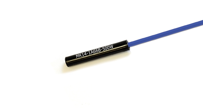 Caractéristiques de la famille MK14: Distance ouverture / fermeture entre 25 et 53 mm. Tension 180V, courant de 0,5A au moment de la commutation et de 1,25A lorsque le contact est établi et que les lames sont fermées, le tout avec dans une limite en puissance de 10W.