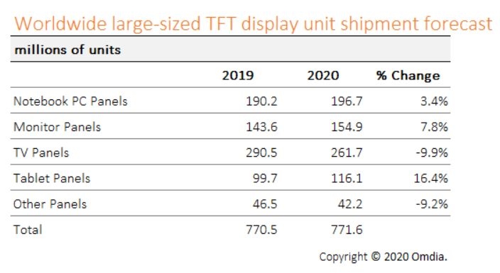 Malgré la crise sanitaire et à la faveur d’un rebond débuté au cours du 2è trimestre, le marché mondial des écrans plats de 9 pouces et plus devrait très légèrement augmenter cette année, selon Omdia, à 771,6 millions d’unités.