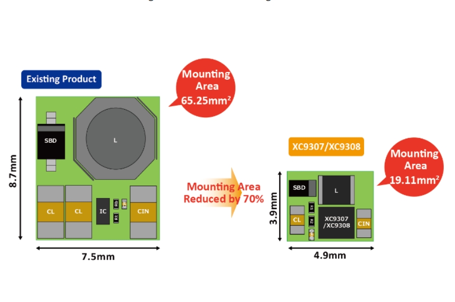 Torex Semiconductor cible les appareils électroniques fins avec les XC9307/08, des convertisseurs DC-DC à tension de sortie négative encapsulés dans un boîtier miniature USP-6EL de 1,8x2x0,4mm. Fonctionnant avec une fréquence de découpage élevée (2,5MHz), ces circuits ne requièrent pas de condensateurs et inductances externes volumineux. Les XC9307/08 délivrent jusqu’à 300mA (avec 3,3V en entrée et -3V en sortie), la tension de sortie pouvant être ajustée entre -1,2V et -6V au moyen de résistances externes. Le XC9307 à sortie PWM sera privilégié pour les applications à faible bruit, le XC9308, qui commute automatiquement entre les modulations PWM et PFM, trouvera lui davantage sa place dans les systèmes nécessitant également un rendement élevé à faible charge.