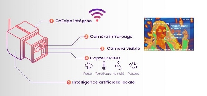 Cette solution est composée de la CYBox-cov, une caméra multicapteurs avec intelligence artificielle embarquée et du logiciel CYManager qui permet un retour d’informations, avec data visualisation pour l’expérience utilisateur.