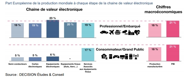Jadis les États-Unis, l’Europe et le Japon dominaient l’écosystème électronique mondial, mais aujourd’hui l’Asie a conquis la part du lion dans les segments de consommation de masse (ordinateurs, téléphones, audio-vidéo), et progresse rapidement dans les segments plus professionnels et embarqués. Pour l’ensemble de la production électronique, l’Europe se situe au 4è rang mondial, derrière la Chine, le reste de l’Asie, et l’Amérique du Nord. Le côté positif est que l’Europe est en bonne position sur les segments de marchés finals où la croissance devrait être la plus forte sur la période d’ici 2022.