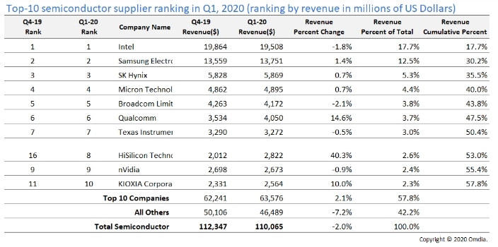 Les 10 premiers fabricants de semi-conducteurs ont collectivement généré des revenus de 63,6 milliards de dollars au premier trimestre, contre 62,2 milliards de dollars au quatrième trimestre 2019, en hausse de 2,1%, tandis que le marché des semi-conducteurs dans son ensemble a enregistré une baisse séquentielle de 2% au cours de cette même période.