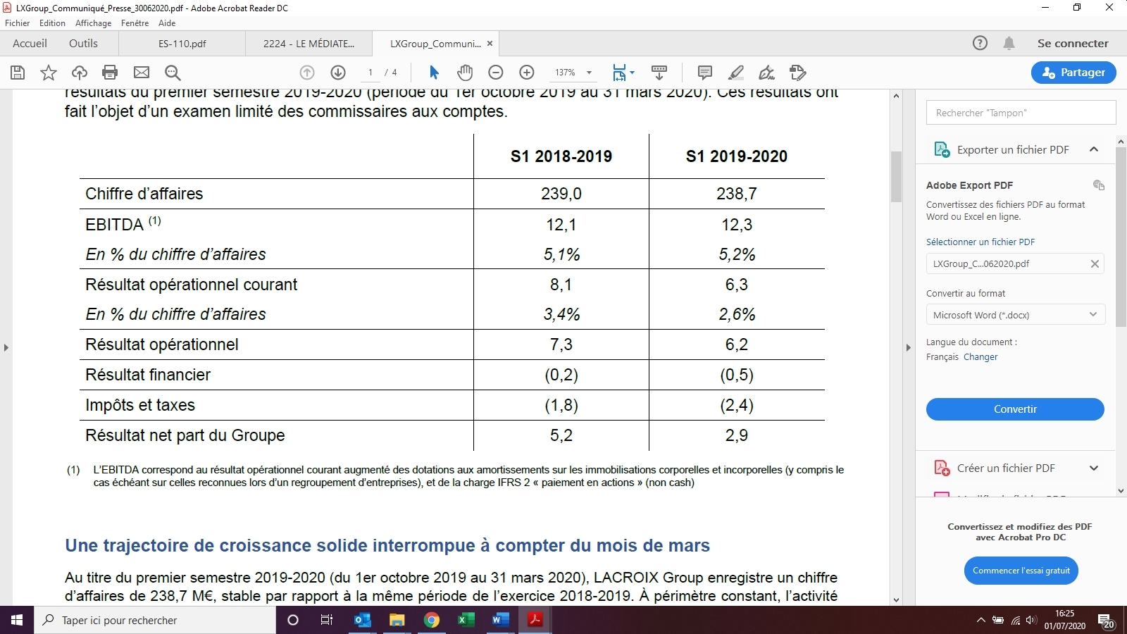 Après un premier trimestre en progression de 7,6% et une trajectoire de croissance supérieure à 6% en janvier-février parfaitement en ligne avec les attentes, la crise sanitaire s’est traduite par un ralentissement fort et rapide de l’activité à compter du mois de mars. Cet impact s’illustre dans l’évolution du chiffre d’affaires du deuxième trimestre, en baisse de 7,5% par rapport à la même période de 2018-2019. Le groupe estime ainsi la perte d’activité liée à cette crise exceptionnelle à environ 17 M€ à fin mars.