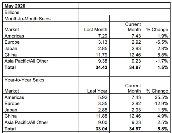 Les ventes mondiales de semi-conducteurs se sont élevés à 35 milliards de dollars en mai 2020, en progression de 5,8% par rapport au total de mai 2019 de 1,5% par rapport à avril 2020, selon le WSTS (World Semiconductor Trade Statistics), l’organisme en charge des statistiques mondiales sur le marché des semi-conducteurs, relayées par la SIA (Semiconductor Industry Association), l’organisation professionnelle américaine du secteur.