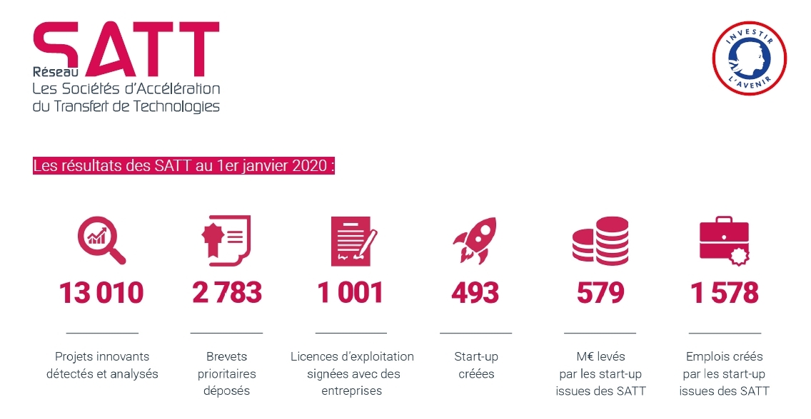 Le succès est au rendez-vous pour les start-up issues des actions de SATT : 50% des lauréats des programmes tels que Netva et French Healthcare ont bénéficié de l’accompagnement des SATT et les levées de fonds ont progressé de 50% sur l’année 2019. En outre, une étude réalisée en 2019 auprès de 100 entreprises, PME et ETI, démontre que l’action des SATT a permis une croissance moyenne de 21% du chiffre d’affaires des entreprises bénéficiaires de leurs actions et de 17% de la valeur ajoutée dans les années suivant le transfert de technologies.