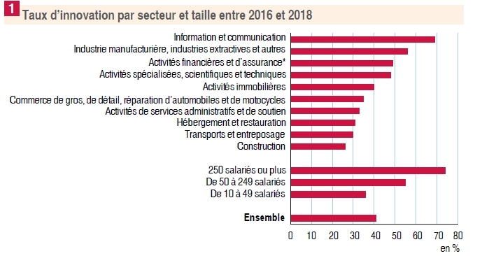 Entre 2016 et 2018, 41 % des sociétés de 10 salariés ou plus ont innové dans les secteurs marchands non agricoles. Elles ont plus souvent innové en procédés (33%) qu’en produits (25%). Parmi les sociétés innovantes en produits, 68% ont introduit au moins un nouveau produit sur un de leurs marchés. Innover est plus fréquent dans l’information-communication (69% de sociétés innovantes), l’industrie (56%), les activités financières et d’assurance (49%) et les activités spécialisées, scientifiques et techniques (48%). La transformation numérique continue de stimuler les activités d’innovation, du système de production à l’expérience client. Tels sont les enseignements d’une étude de l’Insee intitulée « Le numérique stimule l’innovation dans le secteur tertiaire »;