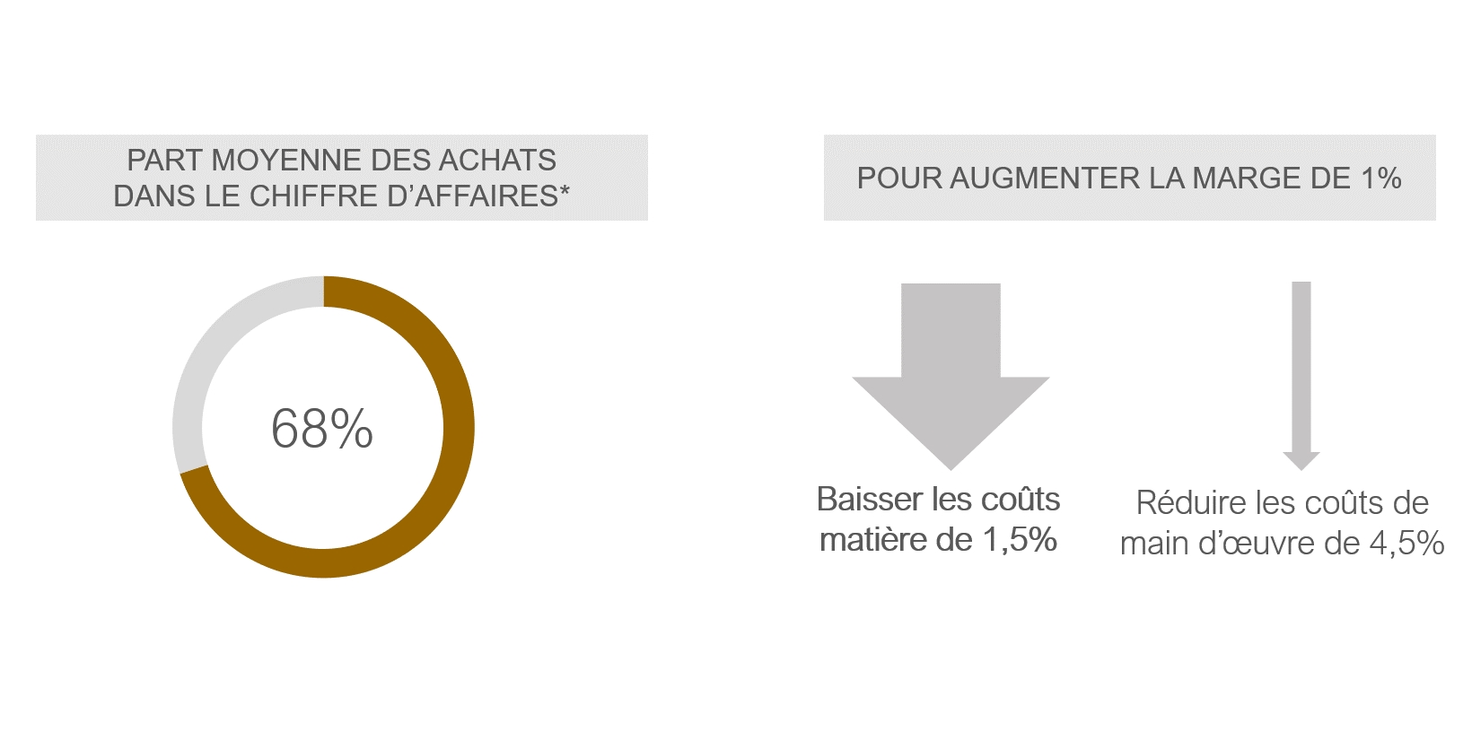 En moyenne les achats représentent 68% du chiffre d’affaires. Ils constituent donc un levier majeur pour augmenter la marge.