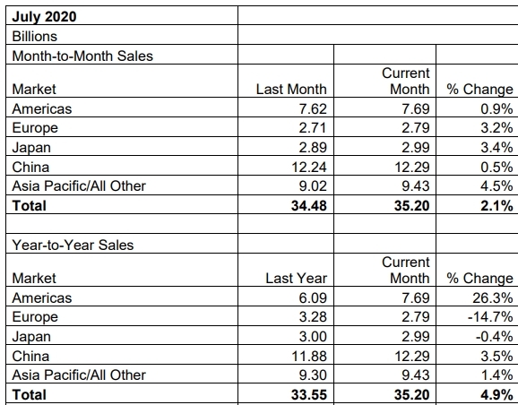 Les ventes mondiales de semi-conducteurs se sont éélevées à 35,2 milliards de dollars en juillet 2020, en hausse de 4,9% par rapport à juillet 2019 et en progression de 2,1% par rapport à juin 2020, selon le WSTS (World Semiconductor Trade Statistics), l’organisation mondiale en charge des statitiques sur l’industrie des semi-conducteurs, relayées par la SIA, l’association américaine de l’industrie des semi-conducteurs.