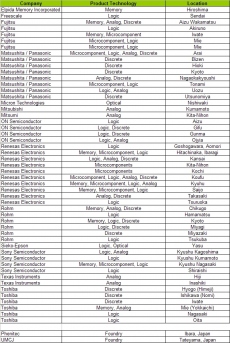 IHS iSuppli a répertorié 130 lignes de fabrication de semi-conducteurs en grand volume au Japon établies sur 53 sites (voir tableau ci-contre), unités de R&D non incluses. Le cabinet d’études estime que beaucoup d’acheteurs à travers le monde pourraient s’engager dans des achats de composants électroniques de “panique” motivés par la crainte de ruptures d’approvisionnement de la part de ces usines. Les distributeurs de composants électroniques ressentent d’ailleurs un soudain afflux de commandes de la part des clients OEM qui s’assurent ainsi d’avoir des stocks suffisants pour surmonter d’éventuelles interruptions d’approvisionnement.