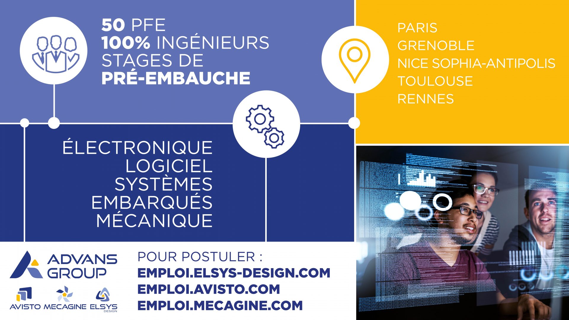 Elsys Design et Avisto, des sociétés d’Advans Group, proposent des stages de pré-embauche de niveau Bac+5 débutant le 1er trimestre 2021.