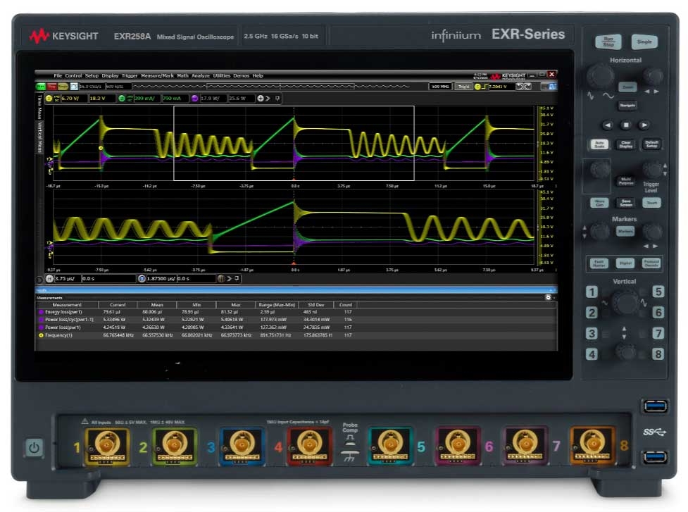 Les différents modèles de la nouvelle famille Infiniium EXR affichent 4 ou 8 entrées analogiques – et 16 voies logiques avec l’option EXR2MSO –, une bande passante de 500 MHz à 2,5 GHz, une fréquence d’échantillonnage de 16 Géch/s sur toutes les voies, avec une résolution verticale de 10 bits (16 bits en mode haute résolution), un taux de rafraîchissement supérieur à 200 000 formes d’onde/s, une profondeur mémoire de 100 Mpoints par voie – 400 Mpoints par voie en option –, etc.
