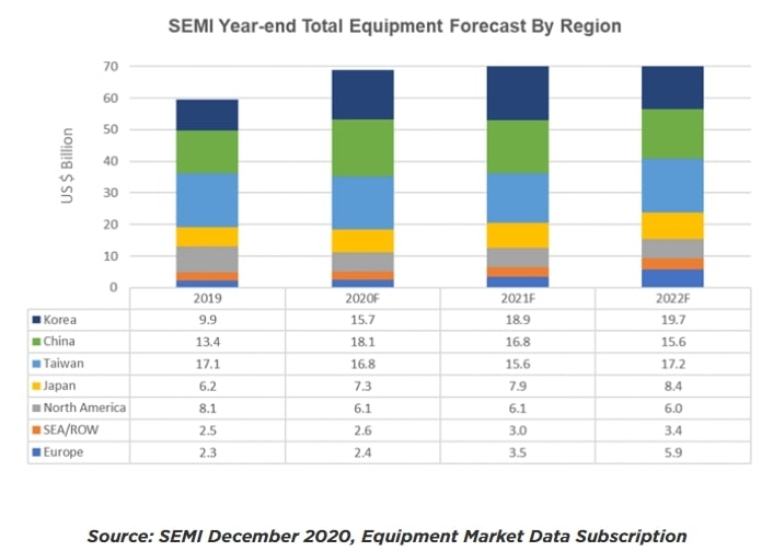 La Chine, Taïwan et la Corée devraient être les principaux pays dépensiers d’équipements de semi-conducteurs en 2020, avec la Chine qui devrait être leader du marché total pour la première fois cette année. Elle devrait toutefois laisser sa place à la Corée en 2021 et 2022.
